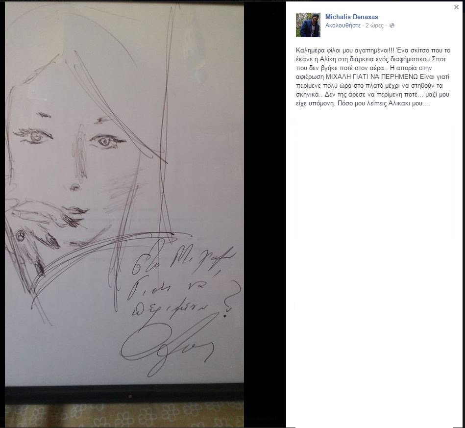 Ο τηλεοπτικός παραγωγός Μιχάλης Δεναξάς, έγραψε στο facebook: «Καλημέρα φίλοι μου αγαπημένοι!!! Ένα σκίτσο που το έκανε η Αλίκη στη διάρκεια ενός διαφήμιστικου Σποτ που δεν βγήκε ποτέ στον αέρα.. Η απορία στην αφιέρωση ΜΙΧΑΛΗ ΓΙΑΤΙ ΝΑ ΠΕΡΙΜΕΝΩ Είναι γιατί περίμενε πολύ ώρα στο πλατό μέχρι να στηθούν τα σκηνικά.. Δεν της άρεσε να περίμενει ποτέ… μαζί μου είχε υπόμονη. Πόσο μου λείπεις Αλικάκι μου…».