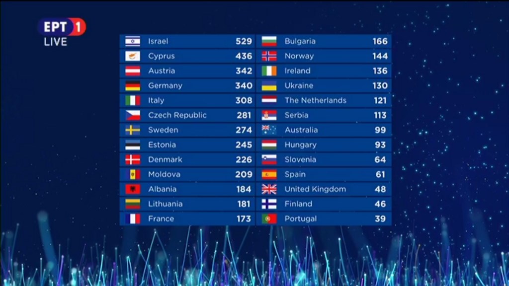 Η Κύπρος κατάφερε να συγκεντρώσει 436 βαθμούς έναντι 529 που κατάφερε να πάρει το Ισραήλ με τη Νέτα επιστρέφοντας στην κορυφή του διαγωνισμού έπειτα από 20 χρόνια.