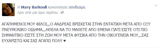 ( Αγαπημένοι μου φίλοι, ο Ανδρέας βρίσκεται στην εντατική μετά από οξύ πνευμονικό οίδημα. Ήθελα να το μάθετε από εμένα, γιατί είστε ό,τι πιο σημαντικό στη ζωή μου μετά φυσικά από την οικογένειά μου. Σας ευχαριστώ και σας αγαπώ πολύ).