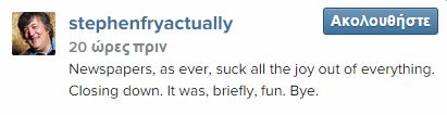 «Τέρμα το κυνηγητό. Αντίο». Με αυτά τα λόγια ο ηθοποιός – και υπέρμαχος του επαναπατρισμού των Γλυπτών του Παρθενώνα Στίβεν Φράι αποχαιρέτησε τους 92.000 ακολούθους του στο instagram.