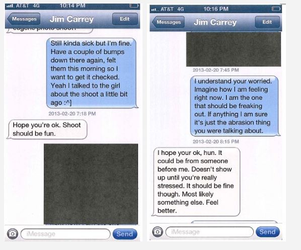 Στη συνέχεια των μηνυμάτων φαίνεται πως ο ηθοποιός προσπαθεί προφανώς να την καθησυχάσει για κάποια πιθανά σημάδια σεξουαλικά μεταδιδόμενων νοσημάτων, υποστηρίζοντας πως μπορεί να οφείλονται απλώς στην έντονη σεξουαλική δραστηριότητα του ζεύγους.