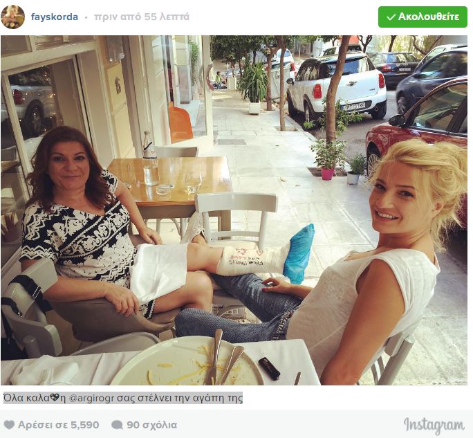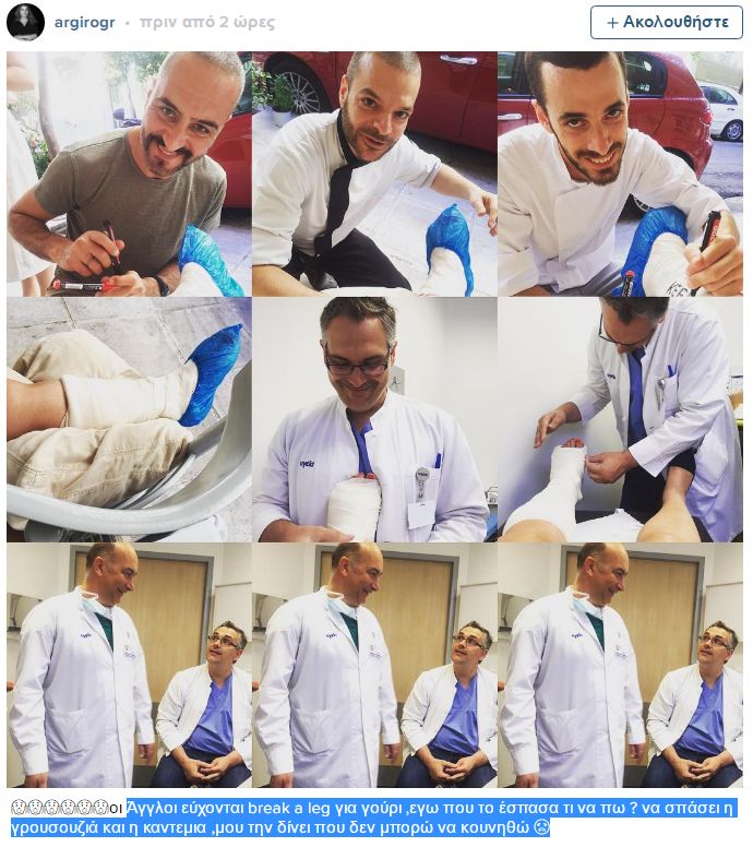 Μέσω Instagram ανέβασε την παρακάτω φωτογραφία και έγραψε στη λεζάντα: «Άγγλοι εύχονται break a leg για γούρι, εγώ που το έσπασα τι να πω; Να σπάσει η γρουσουζιά και η γκαντεμιά, μου την δίνει που δεν μπορώ να κουνηθώ».