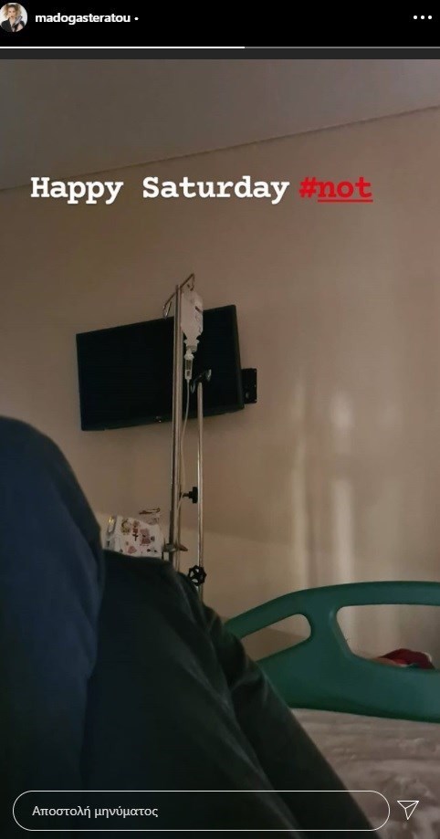 Στο νοσοκομείο βρίσκεται από το πρωί του Σαββάτου η Μαντώ Γαστεράτου, όπως έκανε γνωστό η ίδια μέσα από story που ανέβασε στο Instagram. Συγκεκριμένα, η παρουσιάστρια και ραδιοφωνική παραγωγός δημοσίευσε μια φωτογραφία στην οποία φαίνεται να είναι ξαπλωμένη στο κρεβάτι του νοσοκομείου και στο βάθος να βρίσκεται ένας ορός. «Happy Saturday #not», ήταν το σχόλιο με το οποίο συνόδευσε τη φωτογραφία της χωρίς ωστόσο να θελήσει να δώσει περισσότερες πληροφορίες.