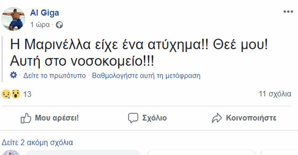 Στο νοσοκομείο μεταφέρθηκε η Μαρινέλλα το απόγευμα της Κυριακής έπειτα από ατύχημα που είχε στο νυχτερινό κέντρο που εμφανίζεται.Όπως αποκάλυψε ο στυλίστας της Έλενας Παπαρίζου, Al Giga, η μεγάλη κυρία του ελληνικού τραγουδιού έπεσε από τις σκάλες στο νυχτερινό κέντρο όπου είχε βρεθεί από νωρίς σήμερα το απόγευμα προκειμένου να φέρει μαζί με τους υπόλοιπους συντελεστές του σχήματος (μεταξύ αυτών η Έλενα, ο Κώστας Μακεδόνας, η Ήβη Αδάμου και οι αδελφοί Τσαχουρίδη) το πρόγραμμά τους που ξεκινούσε περίπου στις 19,00. Η πτώση της έγινε καθώς κατέβαινε για να πάει στο καμαρίνι της. Μόλις είχε φτάσει στο μαγαζί.Αμέσως μετά την πτώση, σύμφωνα με πληροφορίες του gossip-tv.gr, μεταφέρθηκε στο νοσοκομείο και υποβλήθηκε σε εξετάσεις. Όμως άγνωστο παραμένει αν θα υποβληθεί τελικά σε χειρουργείο. Σύμφωνα με τα όσα έχουν γίνει μέχρι στιγμής γνωστά, έχει χτυπήσει τον γοφό της και υπάρχει μεγάλη πιθανότητα να χρειαστεί να περάσει την πόρτα του χειρουργείου προκειμένου να αποκατασταθεί η βλάβη που έχει υποστεί από την πτώση. Αξίζει να σημειωθεί ότι σήμερα ήταν η τελευταία παράσταση για τους συντελεστές του σχήματος το οποίο αναγκάστηκε να φέρει σε πέρας τη βραδιά χωρίς τη Μαρινέλλα η οποία οδηγήθηκε εσπευσμένα στο νοσοκομείο. Δείτε την ανάρτηση: