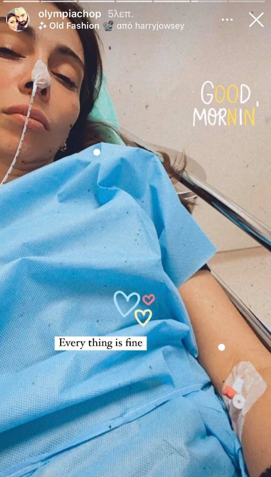 Η Ολυμπία Χοψονίδου ανέβασε στα Instagram Stories της, μία φωτογραφία στην οποία είναι ξαπλωμένη και έχει ορό στο χέρι. Η σύζυγος του Βασίλη Σπανούλη καθησύχασε τους διαδικτυακούς της φίλους λέγοντας πως είναι όλα καλά.