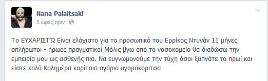 Στο νοσοκομείο βρίσκεται η δημοσιογράφος Νανά Παλαιτσάκη καθώς έγραψε στο προφίλ της στο facebook: “Το ευχαριστώ είναι ελάχιστο για το προσωπικό του Ερρίκος Ντυνάν 11 μήνες απλήρωτοι – ήρωες πραγματικοί. Μόλις βγω από το νοσοκομείο θα διαδώσω την εμπειρία μου ως ασθενής πια. Να ευγνωμονούμε την τύχη όσοι ξυπνάτε το πρωί και είστε καλά. Καλημέρα κορίτσια, αγόρια και αγοροκοριτσα”.