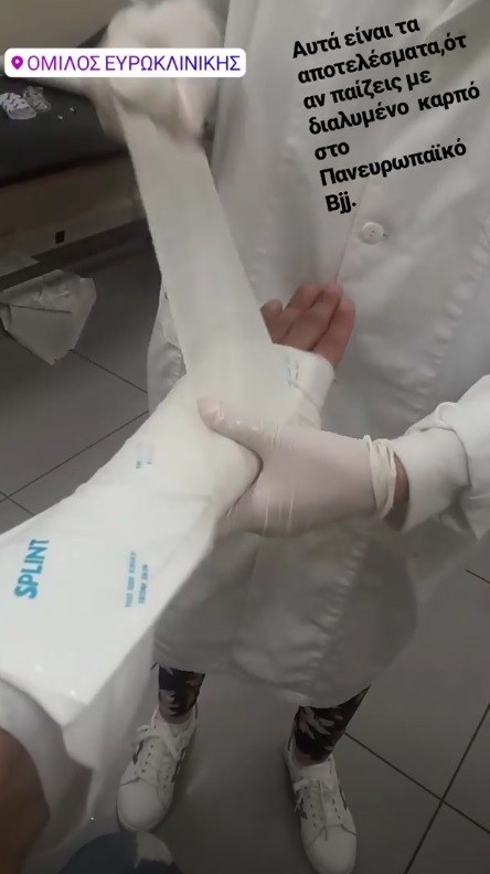 Ο ίδιος ενημέρωσε τους διαδικτυακούς του φίλους για την επίσκεψή του στο νοσοκομείο, μέσω των instastories, δείχνοντας μάλιστα τον δεμένο του καρπό. Αποκάλυψε επίσης ότι αγωνίστηκε με διαλυμένο καρπό στον πρόσφατο αγώνα του στο Πανευρωπαϊκό του Bjj και ρώτησε τον γιατρό του πότε θα ξαναπαλέψει.