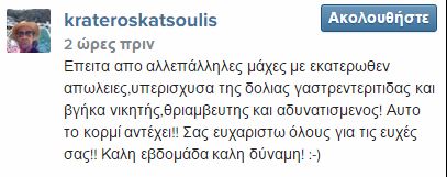 Ο Κρατερός Κατσούλης έγραψε στο instagram: “Έπειτα απο αλλεπάλληλες μάχες με εκατέρωθεν απώλειες, υπερίσχυσα της δόλιας γαστρεντερίτιδας και βγήκα νικητής, θριαμβευτής και αδυνατισμένος! Αυτό το κορμί αντέχει! Σας ευχαριστώ όλους για τις ευχές σας! Καλή εβδομάδα, καλή δύναμη!”.