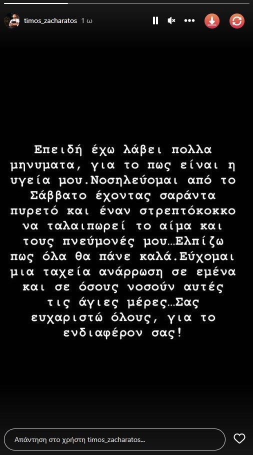 Στο νοσοκομείο βρίσκεται ο Τίμος Ζαχαράτος, όπως γνωστοποίησε ο ίδιος μέσα από τον προσωπικό του λογαριασμό στο Instagram.