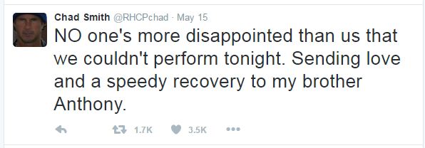 «Κανένας δεν είναι περισσότερο απογοητευμένος από εμάς που δεν μπορούμε να εμφανιστούμε απόψε στη σκηνή. Στέλνω την αγάπη μου για ταχεία ανάρρωση στον αδελφό του Άντονι», έγραψε στο Twitter ο ντράμερ των Chili Peppers, Τσαντ Σμιθ.