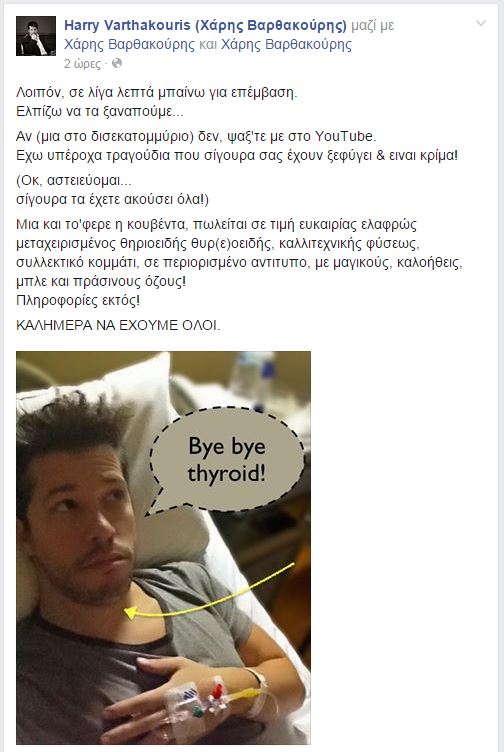 Την είδηση έκανε γνωστή ο ίδιος ο τραγουδιστής μέσα από το προσωπικό του προφίλ στο facebook, λέγοντας πως μπαίνει χειρουργείο για να βγάλει τον θυροειδή του.