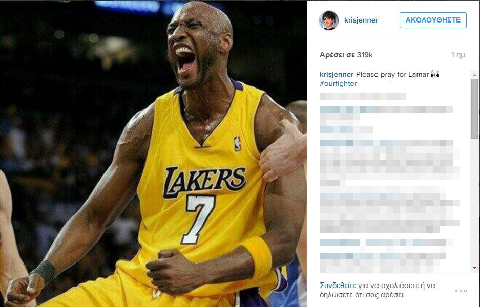 Η Κρις ανέβασε στο Instagram μία φωτογραφία της με τον Λαμάρ ύστερα από έναν αγώνα των Λέικερς στο Λος Άντζελες γράφοντας: «Παρακαλώ προσευχηθείτε για τον Λαμάρ #ourfighter».