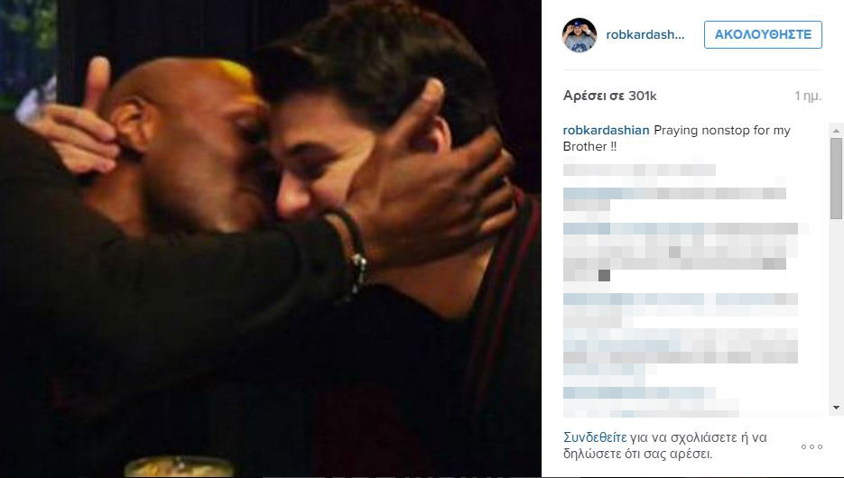 Αλλά και ο Ρομπ Καρντάσιαν μοιράστηκε με τους διαδικτυακούς του φίλους μία ανάρτηση που έλεγε: «Προσεύχομαι ασταμάτητα για τον αδελφό μου!!», ενώ δέχεται χιλιάδες μηνύματα συμπαράστασης καθώς ο Ρομπ ήταν πολύ κοντά στον Λαμάρ όσο καιρό ήταν παντρεμένος με την αδελφή του Κλοέ, και μάλιστα για μεγάλο χρονικό διάστημα ο Ρομπ ζούσε στο σπίτι της Κλοέ και του Λαμάρ.