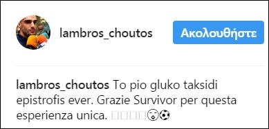 O πρώην παίκτης των «διασήμων» ανέβασε μια φωτογραφία στο Instagram γράφοντας χαρακτηριστικά ότι: «Το πιο γλυκό ταξίδι επιστροφής ever! Ευχαριστώ Survivor για αυτή την μοναδική εμπειρία».