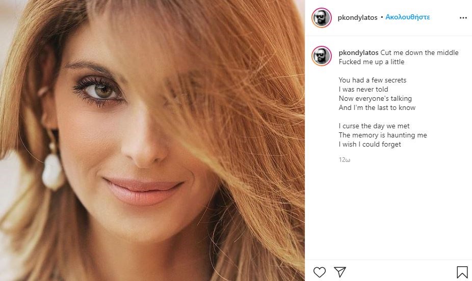 “Είχες μερικά μυστικά που ποτέ δεν μου είχες πει. Τώρα όλοι μιλούν και είμαι ο τελευταίος που ξέρω. Καταριέμαι τη ημέρα που σε γνώρισα. Η μνήμη με στοιχειώνει. Μακάρι να μπορούσα να ξεχάσω», έγραψε ο Περικλής Κονδυλάτος.