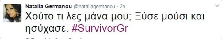Το twitter έχει εξελιχτεί σε αγαπημένη συνήθεια που συνοδεύει το Survivor, Oι χρήστες του Twitter επιστρατεύουν το χιούμορ τους και με ευφάνταστο τρόπο σχολιάζουν τους πρωταγωνιστές του παιχνιδιού.Η Ναταλία Γερμανού είναι φανατική οπαδός του Survivor και δεν διστάζει να σχολιάσει τα «κακώς κείμενα». Στο χθεσινό επεισόδιο, η συμπεριφορά του Χούτου, προκάλεσε τον εκνευρισμό της παρουσιάστριας, η οποία έγραψε: «Χούτο τι λες μάνα μου; Ξύσε μούσι και ησύχασε!».