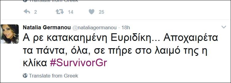 Η απόφαση της Ευρυδίκης Βαλαβάνη να προτείνει τον Γιώργο Αγγελόπουλο ως υποψήφιο για αποχώρηση από το Survivor έχει προκαλέσει θύελλα αντιδράσεων στα social media κυρίως από γυναίκες. Πολλά είναι τα αρνητικά σχόλια εις βάρος της αθλητικογράφου του ΣΚΑΙ γι’ αυτή της την επιλογή, δεδομένου ότι ο Γιώργος Αγγελόπουλος κάνει θραύση στις τηλεθεάτριες του ριάλιτι.Την απόφαση της Ευρυδίκης Βαλαβάνη σχολίασε στο Twitter και η Ναταλία Γερμανού, η οποία της έστειλε ένα ιδιαίτερο μήνυμα. Συγκεκριμένα έγραψε: «Α ρε κατακαημένη Ευρυδίκη. Αποχαιρέτα τα πάντα, όλα, σε πήρε στο λαιμό της η κλίκα».