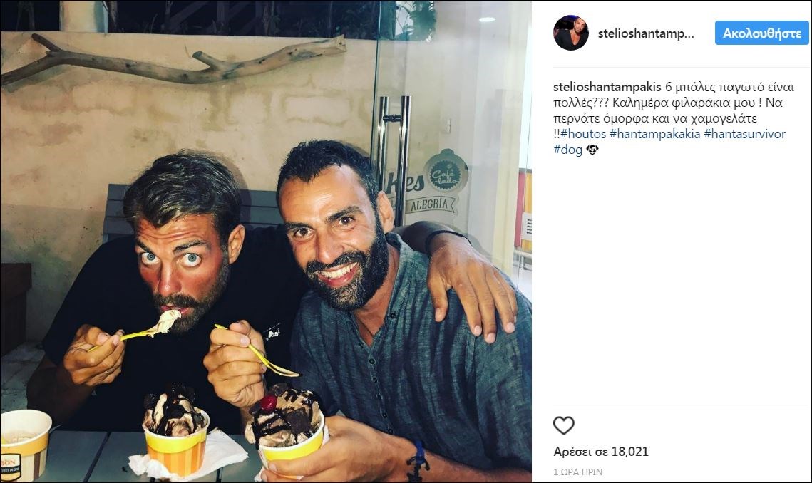 Ο Λάμπρος Χούτος έκανε στενή παρέα με τον Στέλιο Χανταμπάκη στο Survivor, με τους δύο παίκτες να είναι αχώριστοι.Ωστόσο, από ότι φαίνεται η φιλία τους θα συνεχιστεί και εκτός παιχνιδιού. Ο Χανταμπάκης ανέβασε μια φωτογραφία στον προσωπικό του λογαριασμό στο Instagram, γράφοντας: «6 μπάλες παγωτό είναι πολλές??? Καλημέρα φιλαράκια μου ! Να περνάτε όμορφα και να χαμογελάτε !!».