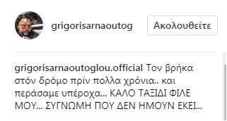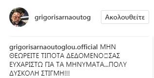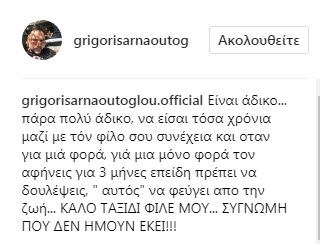 Δύσκολες ώρες περνά ο Γρηγόρης Αρναούτογλου, ο οποίος βρίσκεται στις Φιλιππίνες για τις ανάγκες των γυρισμάτων του νέου ριάλιτι επιβίωσης Nomads.Το αγαπημένο σκυλάκι του παρουσιαστή έφυγε από τη ζωή.Ο ίδιος, με αναρτήσεις στον προσωπικό του λογαριασμό στο Instagram, εξέφρασε τον πόνο του. «Είναι άδικο… πάρα πολύ άδικο, να είσαι τόσα χρόνια μαζί με τον φίλο σου συνέχεια και όταν για μια φορά, για μια μόνο φορά τον αφήνεις για 3 μήνες επειδή πρέπει να δουλέψεις, “αυτός” να φεύγει από την ζωή… Καλό ταξίδι φίλε μου… Συγγνώμη που δεν ήμουν εκεί!!!», «Τον βρήκα στον δρόμο πριν πολλά χρόνια.. και περάσαμε υπέροχα… Καλό ταξίδι φίλε μου… Συγγνώμη που δεν ήμουν εκεί…», «Μην θεωρείτε τίποτα δεδομένο… πολύ δύσκολη στιγμή», έγραψε ο Γρηγόρης Αρναούτογλου, μη μπορώντας σαν κρύψει τη θλίψη του.