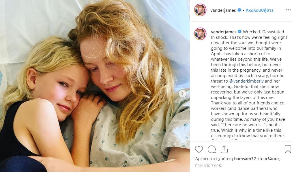Ο Τζέιμς Βαν Ντερ Μπικ ανέβασε στον προσωπικό του λογαριασμό στο Instagram μία φωτογραφία της συζύγου του από το κρεβάτι του νοσοκομείου και έγραψε μεταξύ άλλων: “Συντετριμμένοι. Καταρρακωμένοι. Σε σοκ. Έτσι αισθανόμαστε αυτή τη στιγμή μετά την απώλεια της ψυχής που πιστεύαμε ότι θα υποδεχτούμε στην οικογένεια μας τον Απρίλιο… Το έχουμε περάσει ξανά στο παρελθόν, αλλά ποτέ σε τόσο προχωρημένη εγκυμοσύνη και χωρίς να συνοδεύεται από απειλή για τη ζωή της Kimberly… Όπως πολύ μου είπατε, ‘δεν υπάρχουν λόγια για αυτό’ και είναι αλήθεια. Για αυτό και μόνο ότι ξέρω πως αυτή τη στιγμή είστε δίπλα μου είναι αρκετό”.