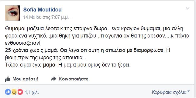 Ιδιαίτερα συγκινητικό ήταν το μήνυμα, το οποίο ανέβασε στον προσωπικό της λογαριασμό στο Facebook, η γνωστή ηθοποιός για τη γιορτή της μητέρας. Η μητέρα της ηθοποιού έφυγε από τη ζωή πριν από 25 χρόνια, όμως η ίδια δεν έχει ξεπεράσει την απώλειά της.Ο λόγος για τη Σοφία Μουτίδου, η οποία έγραψε χαρακτηριστικά: «Θυμάμαι μάζευα λεφτά και της έπαιρνα δώρο… ένα κραγιόν θυμάμαι, μια άλλη φορά ένα νυχτικό… μια θήκη για μπιζού… τι αγωνία αν θα της άρεσαν…. και πάντα ενθουσιαζόταν! 25 χρόνια χωρίς μαμά. Θα έλεγα ότι αυτή η απώλεια με διαμόρφωσε. Η βίαιη, πριν της ώρας της απουσία… Τώρα είμαι εγώ μαμά. Η μαμά μου όμως δεν το ξέρει».