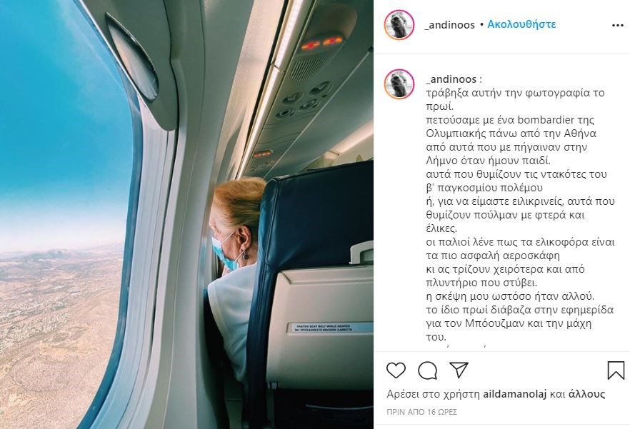 “Τράβηξα αυτήν την φωτογραφία το πρωί. Πετούσαμε με ένα bombardier της Ολυμπιακής πάνω από την Αθήνα από αυτά που με πήγαιναν στην Λήμνο όταν ήμουν παιδί. Αυτά που θυμίζουν τις ντακότες του Β’ Παγκοσμίου Πολέμου ή, για να είμαστε ειλικρινείς, αυτά που θυμίζουν πούλμαν με φτερά και έλικες. Οι παλιοί λένε πως τα ελικοφόρα είναι τα πιο ασφαλή αεροσκάφη κι ας τρίζουν χειρότερα και από πλυντήριο που στύβει. Η σκέψη μου ωστόσο ήταν αλλού. Το ίδιο πρωί διάβαζα στην εφημερίδα για τον Μπόουζμαν και την μάχη του. Αυτήν που έχασε. Και θύμωσα για άλλη μια φορά με τη γλώσσα. Είναι ευεξήγητο το γιατί αυτή η στρατιωτική φρασεολογία έχει διεισδύσει στα μέσα ενημέρωσης και στην καθημερινή ζωή. Σκοπός όσων τη χρησιμοποιούν είναι να δείξουν αλληλεγγύη και αισιοδοξία σε μία αδιανόητα δύσκολη στιγμή στη ζωή κάποιου. Μιλώντας όμως με αυτήν τη γλώσσα μπορεί να φέρουν το αντίθετο αποτέλεσμα”, αναφέρει στην ανάρτησή του ο Αντίνοος Αλμπάνης την οποία συνοδεύει με μία φωτογραφία μέσα από το αεροπλάνο και προσθέτει: