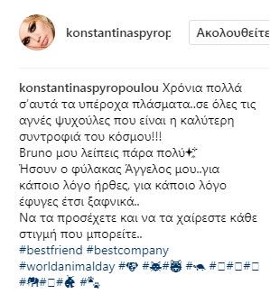 “Χρόνια πολλά σ’αυτά τα υπέροχα πλάσματα… σε όλες τις αγνές ψυχούλες που είναι η καλύτερη συντροφιά του κόσμου!!! Bruno μου λείπεις πάρα πολύ… Ήσουν ο φύλακας Άγγελος μου… για κάποιο λόγο ήρθες, για κάποιο λόγο έφυγες έτσι ξαφνικά.. Να τα προσέχετε και να τα χαίρεστε κάθε στιγμή που μπορείτε..”,
