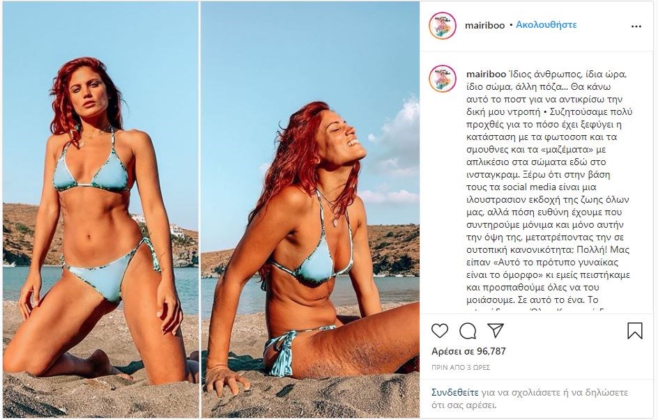 «Ίδιος άνθρωπος, ίδια ώρα, ίδιο σώμα, άλλη πόζα… Θα κάνω αυτό το ποστ για να αντικρίσω την δική μου ντροπή • Συζητούσαμε πολύ προχθές για το πόσο έχει ξεφύγει η κατάσταση με τα φώτοσοπ και τα σμουθνες και τα «μαζέματα» με απλικέισον στα σώματα εδώ στο ίνσταγκραμ. Ξέρω ότι στην βάση τους τα social media είναι μια ιλουστρασιον εκδοχή της ζωής όλων μας, αλλά πόση ευθύνη έχουμε που συντηρούμε μόνιμα και μόνο αυτήν την όψη της, μετατρέποντας την σε ουτοπική κανονικότητα; Πολλή! Μας είπαν «Αυτό το πρότυπο γυναίκας είναι το όμορφο» κι εμείς πειστήκαμε και προσπαθούμε όλες να του μοιάσουμε. Σε αυτό το ένα. Το αψεγάδιαστο. Όλες. Και γιατί; Για να αρέσουμε περισσότερο στους άντρες; Για να μας θαυμάζουν περισσότερο οι γυναίκες; Για να μην αντικρίσουμε ποτέ τον ολόκληρο εαυτό μας; Για να παραμείνουμε βολικά θύματα μιας ολόκληρης βιομηχανίας που μας θέλει να μην αντέχουμε την όψη φλοιού πορτοκαλιού στα πόδια μας, ενώ το 90% από εμάς την έχει; Έλα μωρέ παιδιά… μέχρι πότε; Είμαι 1,67. 60 κιλά. Γυμνάζομαι εδώ και χρόνια. Προσέχω να τρέφομαι υγιεινά όσο μπορώ. Όχι πάντα. Όχι με τον ίδιο τρόπο κάθε περίοδο. Έχω χαλάρωση και κυτταρίτιδα που φαίνονται περισσότερο με συγκεκριμένο φως και σε συγκεκριμένες στάσεις, κυρίως σε αυτές που καθόμαστε κανονικά σαν άνθρωποι δηλαδή και όχι σαν ινφλουένσερς. Και δεν πειράζει. Δεν με ορίζει μια στιβάδα δέρματος. Να μην αρέσουμε καθόλου αν είναι να αρέσουμε μόνο για την λεία στιβάδα δέρματός μας φίλη μου. Μας τραβάει η βαρύτητα κάθε δευτερόλεπτο. Όλα θα αλλοιωθούν αργά ή γρήγορα. Κράτα την ψυχή. [ λίγο πιο αληθινή ]».