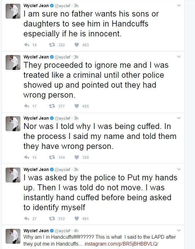 Με χειροπέδες βρέθηκε ξαφνικά γνωστός τραγουδιστής εξαιτίας ενός λάθους της αστυνομίας.Ο ίδιος ανέβασε βίντεο με τη σύλληψή του στο προσωπικό του λογαριασμό στο Twitter.Ο λόγος για τον διάσημο ράπερ Wyclef Jean, τον οποίο οι αστυνομικοί μπέρδεψαν με έναν ένοπλο ληστή που αναζητούσαν. Στο βίντεο, το πρώην μέλος των Fugees προσπαθεί να καταλάβει γιατί τον συνέλαβαν, ενώ ακούγεται να λέει: «Είμαι στο Λος Άντζελες, επιστρέφω από το στούντιο με τον T-Baby και βλέπετε την αστυνομία να μου περνά χειροπέδες. Μου πήραν την μπαντάνα μου. Με συνέλαβαν για το τίποτα».Λίγο αργότερα η αστυνομία επιβεβαίωσε ότι συνέλαβε τον 47χρονο ράπερ, ενώ αναζητούσε έναν ύποπτο ένοπλης ληστείας, σύμφωνα με το Sky News. Οι αστυνομικοί είδαν το αυτοκίνητό του και θεώρησαν ότι έμοιαζε με εκείνο του ληστή.«Άλλο ένα λάθος της αστυνομίας του Λος Άντζελες. Μαύρος άνδρας με κόκκινη μπαντάνα λήστεψε βενζινάδικο ενώ εγώ ήμουν στο στούντιο, αλλά βάζουν σε εμένα χειροπέδες;», έγραψε στο Twitter ο Wyclef Jean.«Με αντιμετώπισαν σαν εγκληματία μέχρι τη στιγμή που εμφανίστηκε άλλος αστυνομικός και τους είπε ότι είχαν πιάσει τον λάθος άνθρωπο», ανέφερε επίσης.«Μου ζήτησαν να σηκώσω ψηλά τα χέρια και στη συνέχεια μου είπαν να μην κουνηθώ. Αμέσως μου πέρασαν χειροπέδες, πριν καν ρωτήσουν ποιο είναι το όνομά μου. Σοκαρίστηκα από αυτή τη συμπεριφορά της αστυνομίας», πρόσθεσε.Ο Wyclef Jean έγινε διάσημος τη δεκαετία του ’90, με το συγκρότημα Fugees, μέλος του οποίου ήταν και η Λόριν Χιλ. Είναι γνωστός για την ανθρωπιστική του δράση ενώ είχε αποπειραθεί να διεκδικήσει την προεδρία της Αϊτής, όπου έχει γεννηθεί, στις εκλογές του 2010.