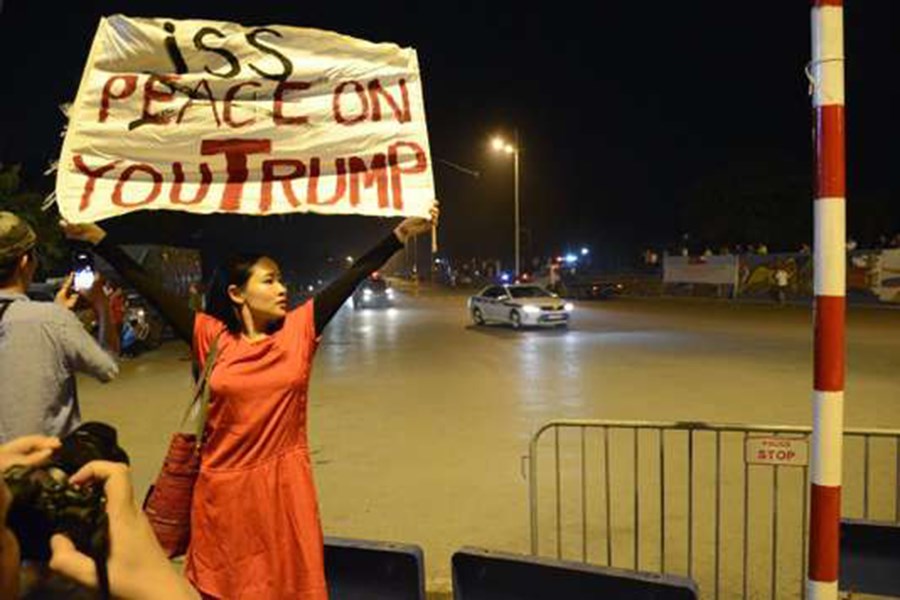 Μια μουσικός, γνωστή υπέρμαχος των ανθρωπίνων δικαιωμάτων, στην οποία οι συμπολίτες της έχουν δώσει το προσωνύμιο η «Lady Gaga» του Βιετνάμ συνελήφθη από αστυνομικούς αφού σήκωσε ένα πλακάτ όπου έγραφε ένα προσβλητικό μήνυμα προς τον πρόεδρο των ΗΠΑ Ντόναλντ Τραμπ (σ.σ σε έχω γραμ… Τραμπ), τη στιγμή που η αυτοκινητοπομπή του μεγιστάνα περνούσε από μπροστά της.