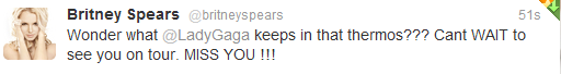 “Οι πραγματικοί φαν ποτέ δεν θα στρέψουν την πλάτη τους σ’ εσένα #ΠάνταΘαΑγαπώΤηBritney Κάποιοι αστέρες είναι πραγματικά τόσο γλυκείς όσο θα πίστευες πως είναι”Αμέσως, η Britney ανταποκρίθηκε με το εξής tweet: “Αναρωτιέμαι τι έχει η Lady Gaga σε αυτό το θερμός; Ανυπομονώ να σε δω στην τουρνέ σου. ΜΟΥ ΛΕΙΠΕΙΣ !!!”