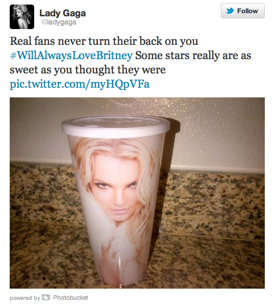 “Οι πραγματικοί φαν ποτέ δεν θα στρέψουν την πλάτη τους σ’ εσένα #ΠάνταΘαΑγαπώΤηBritney Κάποιοι αστέρες είναι πραγματικά τόσο γλυκείς όσο θα πίστευες πως είναι”Αμέσως, η Britney ανταποκρίθηκε με το εξής tweet: “Αναρωτιέμαι τι έχει η Lady Gaga σε αυτό το θερμός; Ανυπομονώ να σε δω στην τουρνέ σου. ΜΟΥ ΛΕΙΠΕΙΣ !!!”