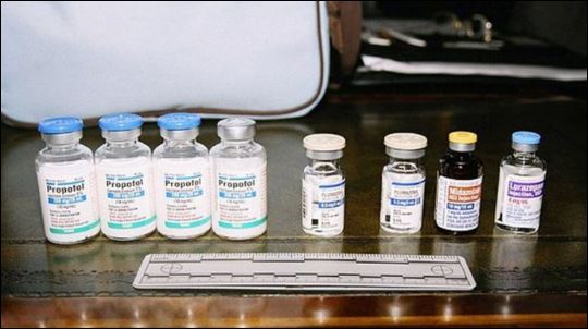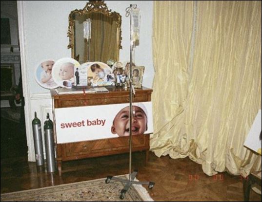 Όπως φαίνεται στις φωτογραφίες, στον χώρο του θρύλου της ποπ υπάρχουν δεκάδες φιαλίδια με ναρκωτικές ουσίες, ένα ματωμένο πουκάμισο, και μια παιδική συρταριέρα, που θυμίζει «βωμό» αφιερωμένο στα μωρά.