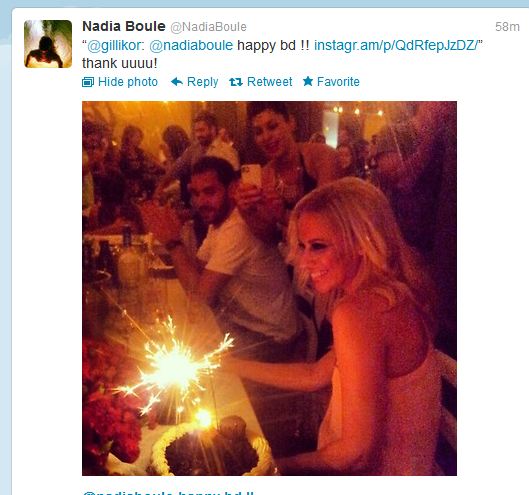 Στον προσωπικό της λογαριασμό στο twitter ανέβασε η νεαρή παρουσιάστρια Νάντια Μπουλέ φωτογραφία από τον εορτασμό των γενεθλίων της.Η ίδια «υποδέχεται» την τούρτα με ένα χαμόγελο, ενώ και οι θαμώνες του μαγαζιού την έβγαλαν φωτογραφία λίγο πριν σβήσει τα κεράκια και της ευχήθηκαν χρόνια πολλά.