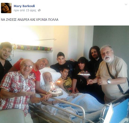 Τα 77 συμπλήρωσε χθες ο σπουδαίος ηθοποιός Ανδρέας Μπάρκουλης, ο οποίος νοσηλεύεται εδώ και αρκετές ημέρες. Στη φωτογραφία που ανέβασε στον προσωπικό της λογαριασμό στο facebook η σύζυγός του, ο ηθοποιός ετοιμάζεται να σβήσει τα κεράκια της τούρτας του με χαμόγελο. Στο πλευρό του εκτός από την σύζυγό του, ο γιος του και στενοί του φίλοι.