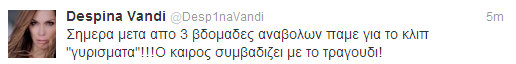 Η Δέσποινα Βανδή σήμερα ξεκινάει το νέο της videoclip με τίτλο ” Γυρίσματα”.Φαίνεται ότι είναι πολύ χαρούμενη, αφού το έγραψε και στο twitter της: