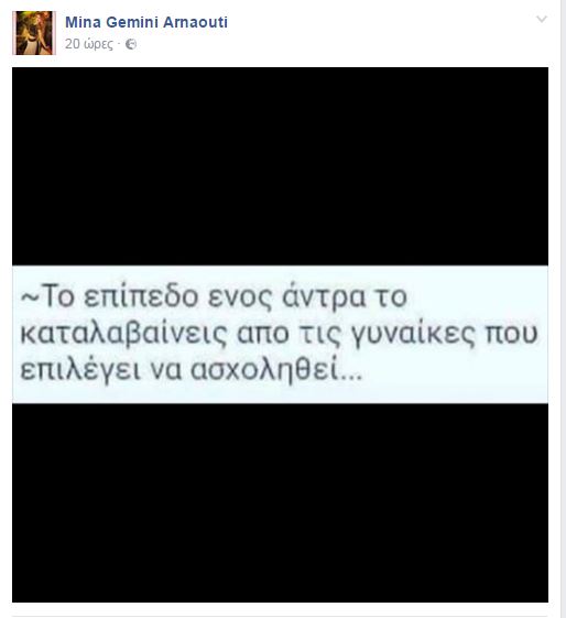 “Το επίπεδο ενός άντρα το καταλαβαίνεις από τις γυναίκες που επιλέγει να ασχοληθεί” έγραφε η πρώτη εικόνα που πόσταρε στο προφίλ της. Μάλιστα, στη συνέχεια η Μίνα Αρναούτη έκανε ένα σχόλιο πάνω σε αυτό, γράφοντας: “Δεν θίγονται ορισμένοι. Για να θιχτείς πρέπει να έχεις και τσίπα”.