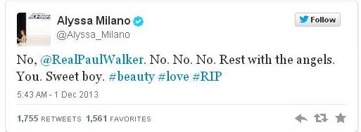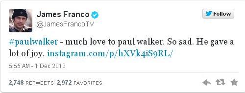 Άλλα μηνύματα είναι της Αλίσα Μιλάνο, η οποία δεν μπορεί καν να πιστέψει αυτό που ακούει: “Όχι, όχι, όχι, Αναπαύσου με τους Αγγέλους, Εσύ γλυκό αγόρι” και του Τζέιμς Φράνκο: “Πολλή αγάπη για τον Πολ Γουόκερ. Λυπήθηκα πολύ. Έδινε μεγάλη χαρά”.