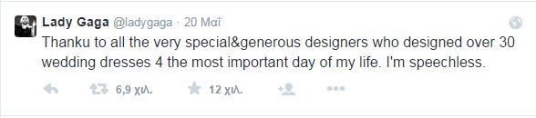 «Ευχαριστώ όλους τους γενναιόδωρους σχεδιαστές που έχουν σχεδιάσει περισσότερα από 30 ιδιαίτερα φορέματα για την πιο σημαντική μέρα τη ζωής μου. Έχω μείνει άφωνη» έγραψε στην σελίδα της στο Twitter.