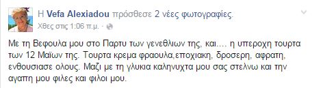 Η γνωστή μαγείρισσα Βέφα Αλεξιάδου έγραψε στο facebook για την εγγονή της: “Με τη Βεφούλα μου στο πάρτυ των γενεθλίων της και η υπέροχη τούρτα των 12 Μαϊων της. Τούρτα κρέμα φράουλα, εποχιακή, δροσερή, αφράτη ενθουσίασε όλους. Μαζί με τη γλυκιά καληνύχτα μου σας στέλνω και την αγάπη μου φίλες και φίλοι μου”.