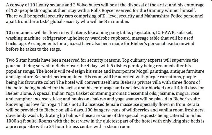 Ενόψει του πολυαναμενόμενου σόου οι προετοιμασίες βρίσκονται σε πλήρη εξέλιξη και ένας από τους διοργανωτές, ο δημοσιογράφος Arjun S Ravi υποστηρίζει ότι έλαβε λίστα των αιτημάτων του Καναδού τραγουδιστή που έχει στρατό φανατικών θαυμαστριών.