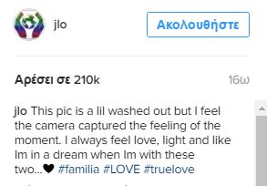 «Αυτή η φωτογραφία είναι λίγο θολή, αλλά νιώθω ότι η κάμερα συνέλαβε το συναίσθημα της στιγμής», έγραψε η Τζένιφερ Λόπεζ και πρόσθεσε: «Πάντα νιώθω αγάπη, πεφωτισμένη και σαν να ζω σε ένα όνειρο όταν είμαι με αυτά τα δύο».