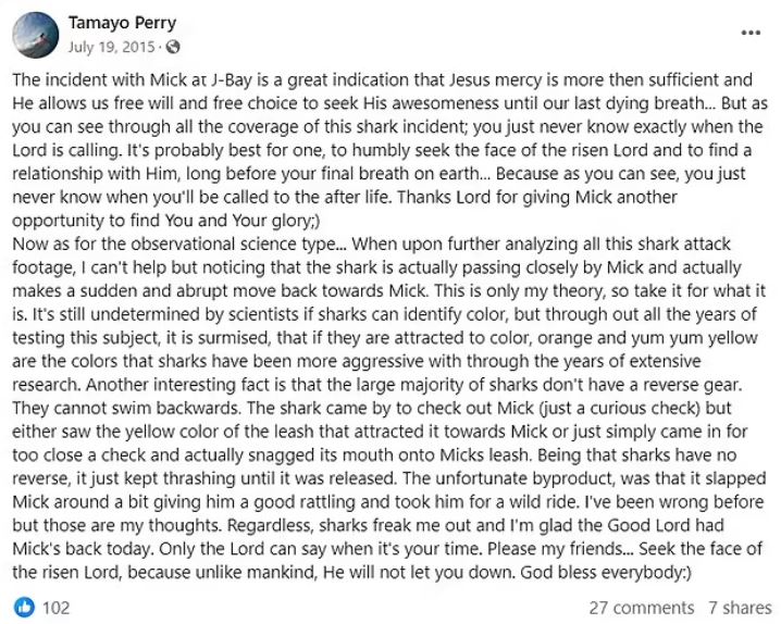 Χαρακτηριστική είναι η ανάρτηση που είχε κάνει τον Ιούλιο του 2015, σχετικά με την επίθεση που είχε δεχθεί ο επίσης σέρφερ Michael Eugene Fanning από δύο καρχαρίες στη Νότια Αφρική.