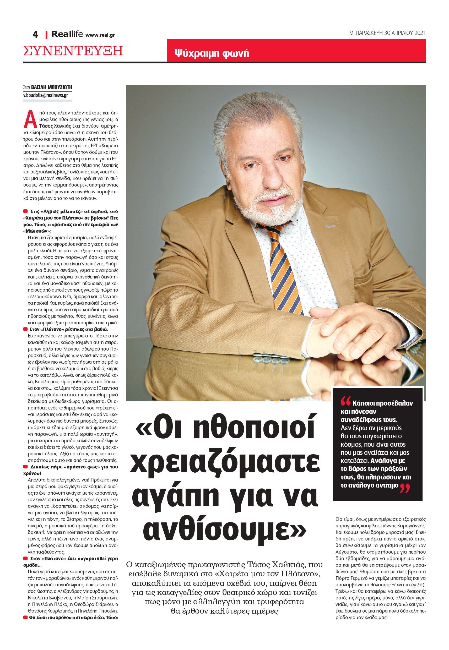Από τους πλέον ταλαντούχους και δημοφιλείς ηθοποιούς της γενιάς του, ο Τάσος Χαλκιάς έχει διανύσει αμέτρητα χιλιόμετρα τόσο πάνω στη σκηνή του θεάτρου όσο και στην τηλεόραση. Αυτή την περίοδο εντυπωσιάζει στη σειρά της ΕΡΤ «Χαιρέτα μου τον Πλάτανο», όπου θα τον δούμε και του χρόνου, ενώ κάνει «μαγειρέματα» και για το θέατρο. Δηλώνει κάθετος στο θέμα της λεκτικής και σεξουαλικής βίας, τονίζοντας πως «αυτή είναι μια μελανή σελίδα, που πρέπει να τη σκίσουμε, να την κομματιάσουμε», αποτρέποντας έτσι όσους σκέφτονται να κινηθούν παραβατικά στο μέλλον από το να το κάνουν.
