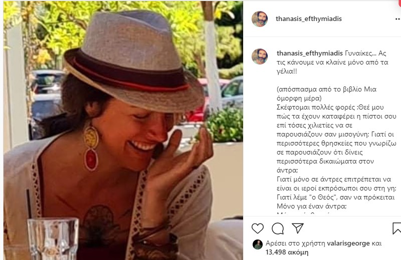 Ο Θανάσης Ευθυμιάδης λατρεύει τη σύζυγό του, Άννα Δημητρίεβιτς. Ο ηθοποιός δημοσίευσε μια αυθόρμητη φωτογραφία της όμορφης συντρόφου του, στέλνοντας παράλληλα ένα μήνυμα για όλες τις γυναίκες με αφορμή τη δολοφονία της 26χρονης Γαρυφαλλιάς στη Φολέγανδρο. Άλλωστε, το ζευγάρι έχει αποκτήσει δύο κόρες και είναι ευαισθητοποιημένοι σε θέματα που αφορούν την ισότητα και την κακοποίηση.