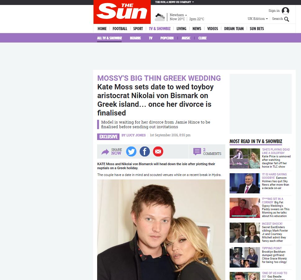 Το δημοσίευμα υποστηρίζει ότι η Κέιτ και ο αγαπημένος της Νικολάι φον Μπίσμαρκ πέρασαν υπέροχα στην Ύδρα και σκέφτονται να παντρευτούν εκεί τους επόμενους μήνες.