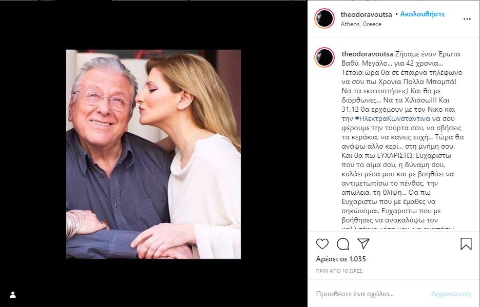 “Ζήσαμε έναν Έρωτα Βαθύ, Μεγάλο… για 42 χρόνια… Τέτοια ώρα θα σε έπαιρνα τηλέφωνο να σου πω “Χρόνια Πολλά Μπαμπά! Να τα εκατοστήσεις!”. Και θα με διόρθωνες… Να τα Χιλιάσω!!! Και 31.12 θα ερχόμουν με τον Νίκο και την Ηλέκτρα – Κωνσταντίνα να σου φέρουμε την τούρτα σου, να σβήσεις τα κεράκια, να κάνεις ευχή… Τώρα θα ανάψω άλλο κερί… στη μνήμη σου. Και θα πω ΕΥΧΑΡΙΣΤΩ. Ευχαριστώ που το αίμα σου, η δύναμη σου, κυλάει μέσα μου και με βοηθάει να αντιμετωπίσω το πένθος, την απώλεια, τη θλίψη… Θα πω Ευχαριστώ που με έμαθες να σηκώνομαι, Ευχαριστώ που με βοήθησες να ανακαλύψω τον καλλιτέχνη μέσα μου, να αγαπήσω τον εαυτό μου, να αισθάνομαι τυχερή που είμαι γυναίκα… Σε ευχαριστώ γιατί με έπεισες ότι είμαι ικανή να κάνω ότι θέλω στη ζωή μου. Σ´ΕΥΧΑΡΙΣΤΩ γιατί υπήρξες ο καλύτερος πατέρας για μένα…