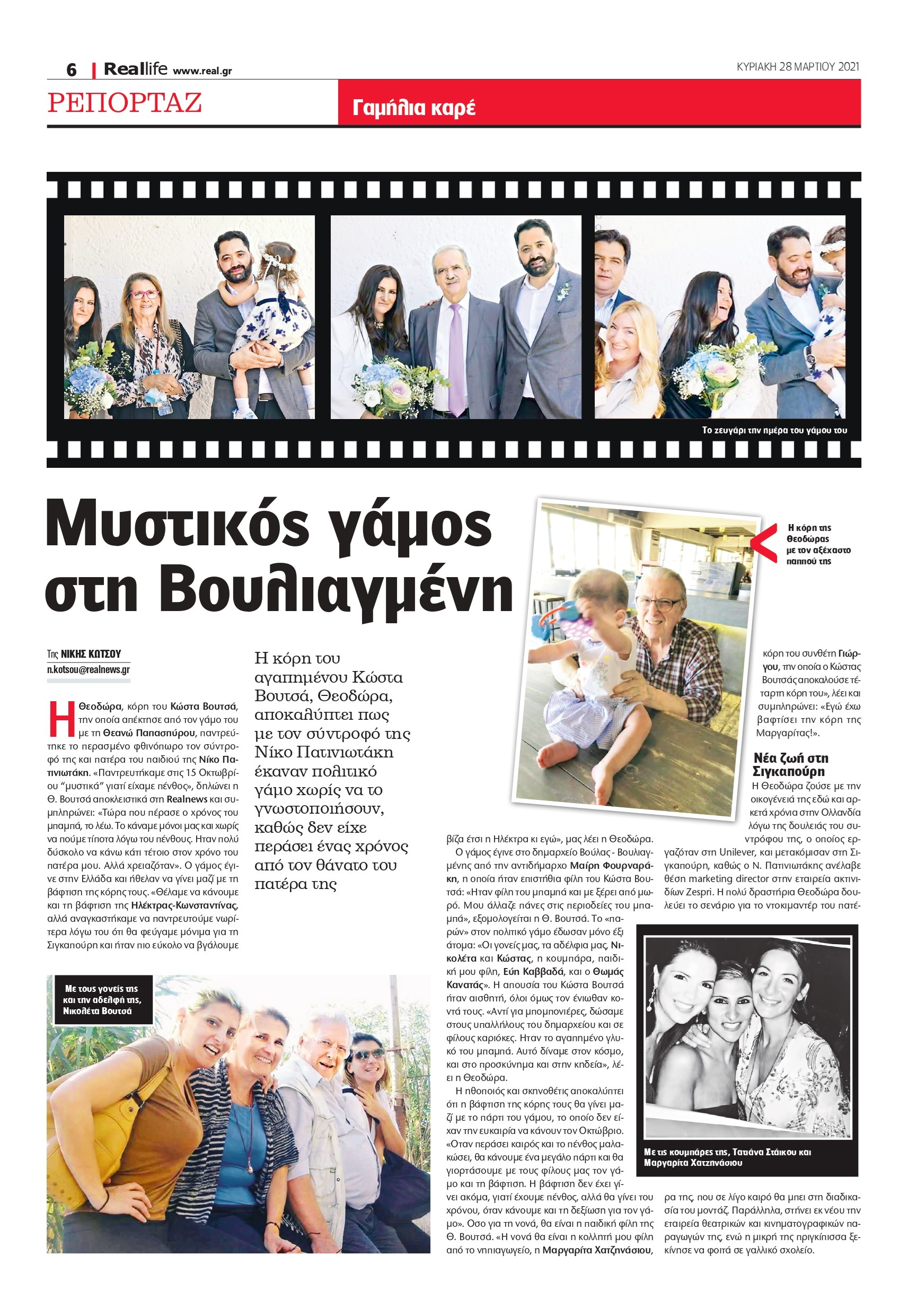 Η Θεοδώρα, κόρη του Κώστα Βουτσά, την οποία απέκτησε από τον γάμο του με τη Θεανώ Παπασπύρου, παντρεύτηκε το περασμένο φθινόπωρο τον σύντροφό της και πατέρα του παιδιού της Νίκο Πατινιωτάκη. «Παντρευτήκαμε στις 15 Οκτωβρίου “μυστικά” γιατί είχαμε πένθος», δηλώνει η Θ. Βουτσά αποκλειστικά στη Realnews και συμπληρώνει: «Τώρα που πέρασε ο χρόνος του μπαμπά, το λέω. Το κάναμε μόνοι μας και χωρίς να πούμε τίποτα λόγω του πένθους. Ήταν πολύ δύσκολο να κάνω κάτι τέτοιο στον χρόνο του πατέρα μου. Αλλά χρειαζόταν». Ο γάμος έγινε στην Ελλάδα και ήθελαν να γίνει μαζί με τη βάφτιση της κόρης τους. «Θέλαμε να κάνουμε και τη βάφτιση της Ηλέκτρας-Κωνσταντίνας, αλλά αναγκαστήκαμε να παντρευτούμε νωρίτερα λόγω του ότι θα φεύγαμε μόνιμα για τη Σιγκαπούρη και ήταν πιο εύκολο να βγάλουμε βίζα έτσι η Ηλέκτρα κι εγώ», μας λέει η Θεοδώρα.