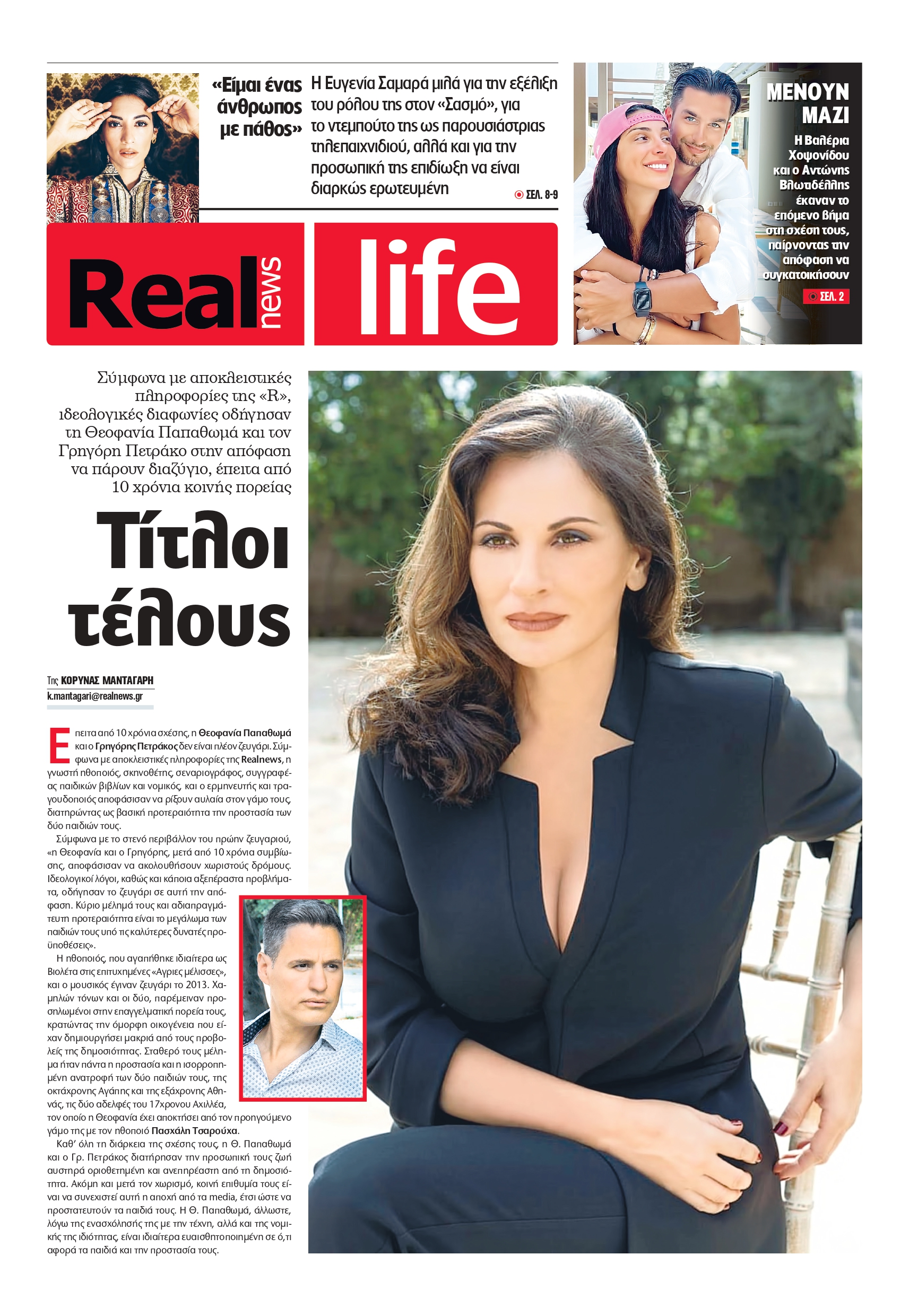 Επειτα από 10 χρόνια σχέσης, η Θεοφανία Παπαθωμά και ο Γρηγόρης Πετράκος δεν είναι πλέον ζευγάρι. Σύμφωνα με αποκλειστικές πληροφορίες της Realnews, η γνωστή ηθοποιός, σκηνοθέτης, σεναριογράφος, συγγραφέας παιδικών βιβλίων και νομικός, και ο ερμηνευτής και τραγουδοποιός αποφάσισαν να ρίξουν αυλαία στον γάμο τους, διατηρώντας ως βασική προτεραιότητα την προστασία των δύο παιδιών τους.