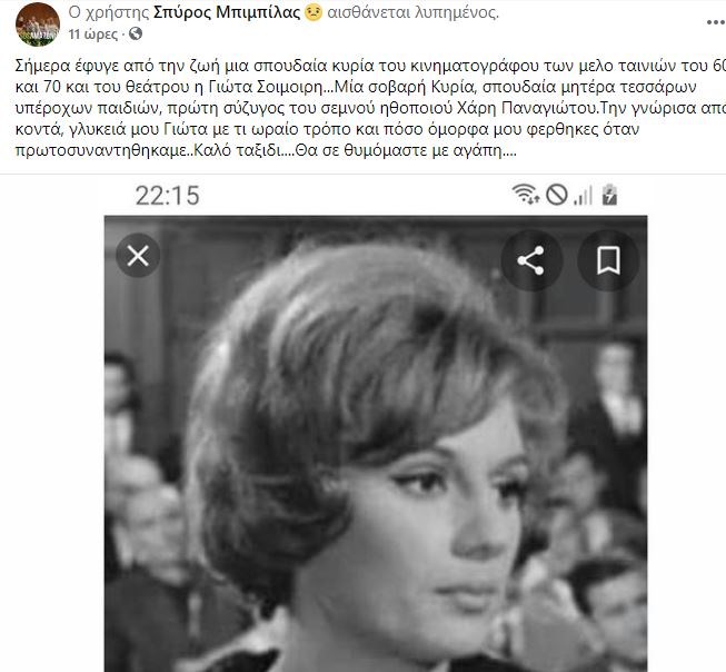 Θρήνος στον καλλιτεχνικό χώρο. Πέθανε η σπουδαία κυρία του κινηματογράφου και του θεάτρου, Γιώτα Σοϊμοίρη. Την είδηση του θανάτου της γνωστοποίηση ο Σπύρος Μπιμπίλας με ανάρτησή του στο Facebook. Όπως έγραψε χαρακτηριστικά ο ηθοποιός, “έφυγε από τη ζωή μια σπουδαία κυρία του κινηματογράφου των μελό ταινιών του ’60 και ’70 και του θεάτρου η Γιώτα Σοϊμοίρη…Μία σοβαρή Κυρία, σπουδαία μητέρα τεσσάρων υπέροχων παιδιών, πρώτη σύζυγος του σεμνού ηθοποιού Χάρη Παναγιώτου. Την γνώρισα από κοντά, γλυκιά μου Γιώτα με τι ωραίο τρόπο και πόσο όμορφα μου φέρθηκες όταν πρωτοσυναντηθήκαμε..Καλό ταξίδι….Θα σε θυμόμαστε με αγάπη….”.